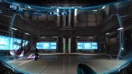 Samus Aran first sees MB watching her from a window overlooking the Experiment Floor in the Cryosphere, and she runs away to the Materials Storehouse after realizing she has been seen. Samus gives pursuit, and tries to convince the woman that she is there to rescue her, much to MB's denial. They are separated after Samus is attacked by a soldier using the RB176 Ferrocrusher.