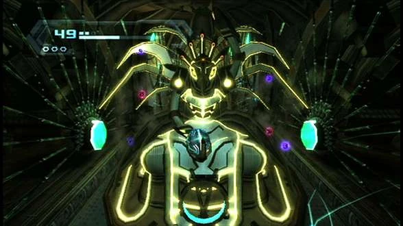 In it lies a Chozo Elder statue entangled in Phazon vines with its right arm extended for Samus Aran to lie in while in Morph Ball mode. Once atop the statue's hand, the barrier that was in front of the statue retracts. When a Morph Ball Bomb is deployed, the statue attempts to move, but fails. In order to clear the statue's path of its Phazon vine obstructions, the Hyper Ball must be performed. After the Phazon vines are removed, the statue retreats downward in a spiraling motion. Once the statue has been removed, two ornamental frames are revealed, hanging between two Grapple Swing Points and obstructing the path. Once destroyed, Samus can grapple across to solid ground with five SkyTown Storage Units along the walls. At the southernmost part of the room lies a SkyTown Blue Door leading to Zipline Station Alpha. "Dragoon" Battle Drones will appear if later revisited.