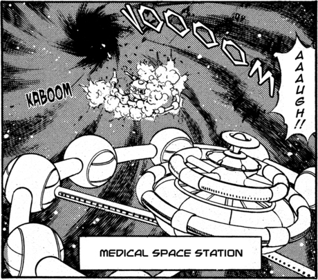 The Medical Space Station is a round space station in an unknown location. It is seen in the final chapter of Metroid EX. The people aboard this station are seen in a montage observing the black hole spawned by Greed in the Extreme Galaxy. One person exclaims that "station nine" has been sucked into the hole. Dr. Diana Apronika, the mother of Joey Apronika, wonders if something has happened to him. Presumably, she came here to resume her medical work after he rescued her on Degrade.