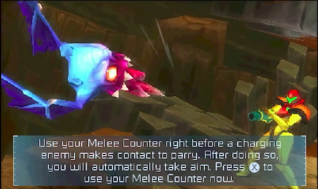 The Melee Counter is a technique that is used to parry enemy attacks. This technique debuted in Metroid: Samus Returns and reappears in Metroid Dread. In both games, it is performed by pressing the X button before a charging enemy makes contact.