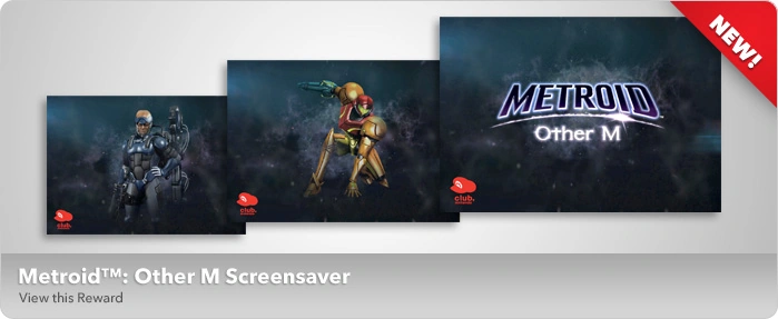 The Metroid: Other M Screensaver is a reward on Club Nintendo and costs ten coins. The screensaver was released on July 25th, 2011, and features a space background that flashes promotional renders of the characters in Metroid: Other M. The images in the screensaver include the game's logo, which is emanating an aura, followed by renders of Samus Aran in her Varia and Zero Suits, and Anthony Higgs. All pictures feature the Club Nintendo logo. Upon purchase, the screensaver becomes available for download.
