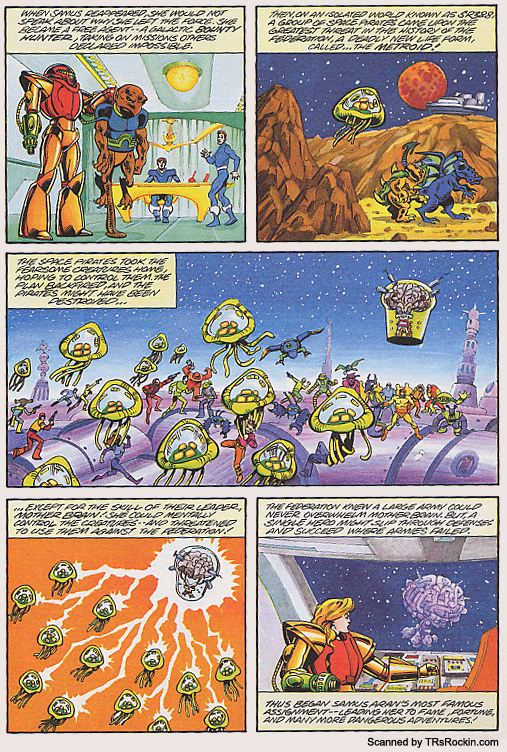 | “ | Metroids! This species of energy draining, unicellular aliens can be frozen, then shattered with a blast from one of my missiles, but when they are in their normal, pulsating state, they can absorb my attack. They're treacherous! | „ |