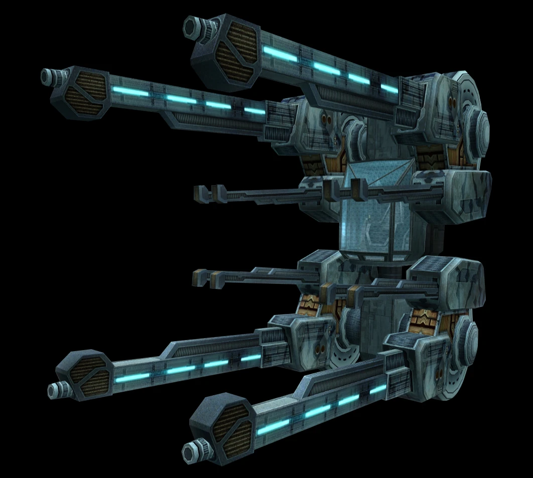 The Mk XIII "Twin Hydra" Multiturret is a turret equipped with four rail cannons. It operates via a targeting system, and is primarily used against enemy starships. Several of them can be found defending the Galactic Federation ship G.F.S. Olympus, and other Olympus-class battleships in the Federation Fleet.