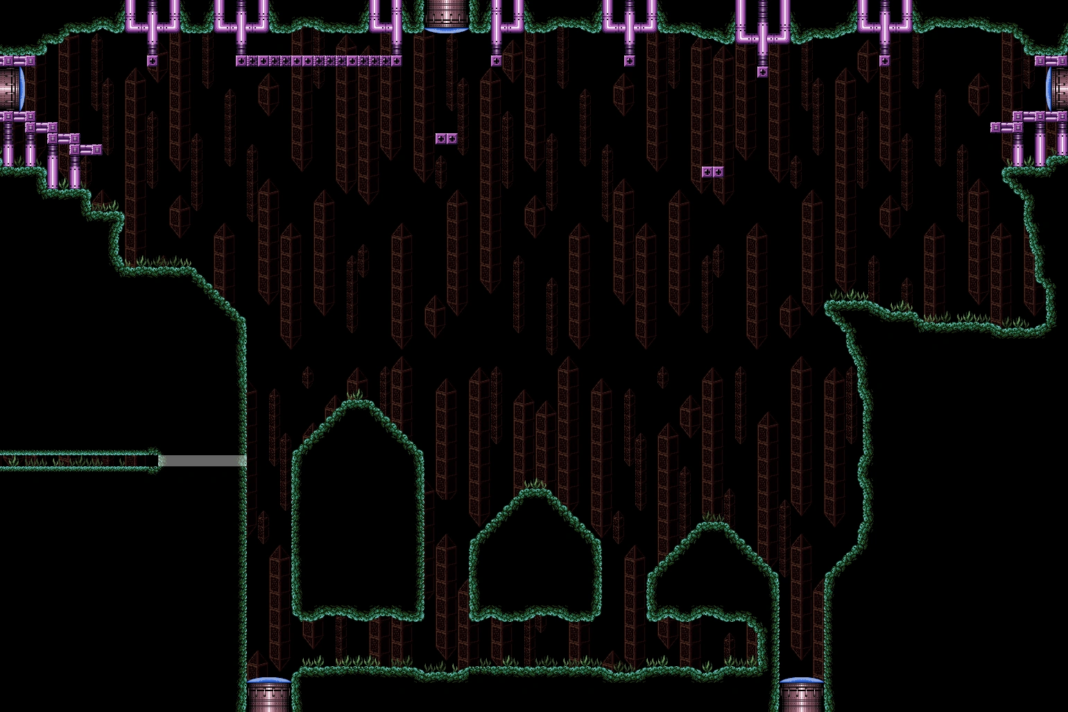 The door to the room is situated on a staircase of sorts made of an articial material, leading to a rocky cliff. The cliff, and other parts of the room are lined with grasses that resemble the Bryyo bomb plant. The lower wall of this cliff has a hidden tunnel into the previous room, a tall cavern, which takes Samus to a hidden Super Missile Tank. At the bottom of the cliff is a Blue Door leading into another room. At the top are a series of Grapple Points, which are used to scale the room and reach the exit, which leads into the second half of Maridia. Some of the Grapple Points are found on pipe structures mounted to the ceiling. There are two pairs of individual Grapple Points in midair as well, which Samus can use if she falls from the ceiling points. She can also stand on them.