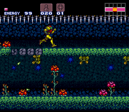 The "n00b bridge" is an infamous room in Brinstar. It appears in Super Metroid. It is a long corridor in the jungle section of Brinstar, with a "bridge" that consists of Pit Blocks, and a ceiling lined with spikes. Apart from this, the only unique feature to the room is the abundance of red and pink bloomed flowers.