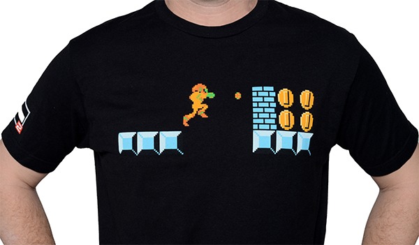 The NES Remix 2 T-Shirt is a special T-shirt released by Club Nintendo in December 2014 for 700 Coins. It was released to promote NES Remix 2. The T-Shirt's front depicts Samus, in her NES Metroid sprite, shooting beam shots at bricks obscuring Gold Coins behind them while in what is implied to be the underground levels of Super Mario Bros, and the logo for NES Remix 2 is featured on the right sleeve.
