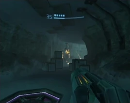 Once the Thermal Visor has been collected, there are no crates, the Auto Defense Turrets are replaced with Sentry Drones, and the room is dark.