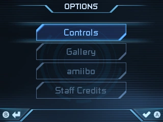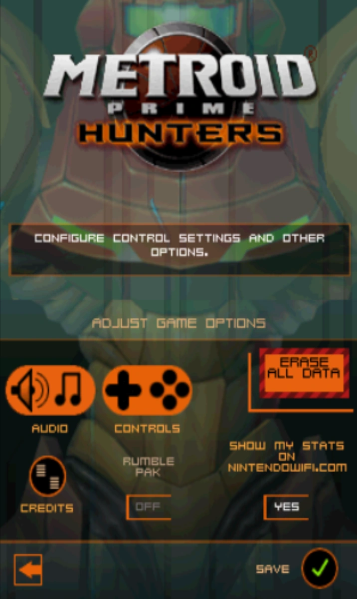 The options menu of Metroid Prime Hunters is simplified from its mainstream brethren. Here, the audio volumes can be adjusted, control schemes selected, the credits can be viewed, Rumble Pak enabled, data erased, and there is an option to show the player's statistics on (the now defunct) nintendowifi.com.