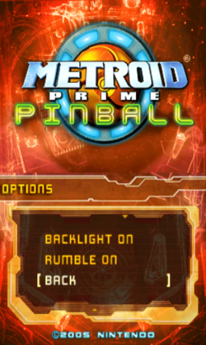The options menu of Metroid Prime Pinball is incredibly simple. Only two options can be toggled here; turning on the Rumble and Backlight features of the Nintendo DS.
