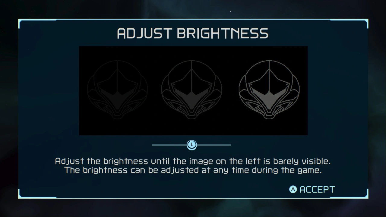 This screen appears the first time the game is loaded, asking players to adjust the brightness until the image of Samus' helmet on the left is nearly invisible. This can be adjusted in the in-game Options menu at any time.