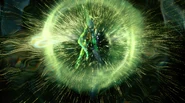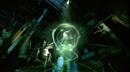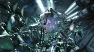 The Bio-Lab was designed by Phil Shearer to resemble a space station environment, with lighting built into the floors and tanks by cinematographer Ross Emery. Plastic sheets and recycled pipes were used to add texture. The lab itself was filmed in a turbine room and great hall at White Bay, with smoke and sparks used for added effect. The enemies, and the corridor through which they emerge into the lab, are entirely animated. The tank that explodes was approximately two meters tall and detonated by the pyrotechnics team. It was filled with water, since that is much more dense than air and would ensure a good spread from the explosion. The explosion was shot at high speed, 350 frames per second, against a black background with splash housings, which was then composited into the shots.[1]