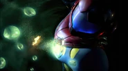 The commercial takes place in the "Metroid Fusion Bio-Lab", a composite location based on the Biologic Space Laboratories research station. As a Hornoad emerges from a corner, it is shot to death. Swarms of Kihunters emerge from an upper corridor, each being shot and killed as they infest the laboratory. A Missile is fired at a tank in the center of the room, causing it to explode and eliminate all enemies. The Missile hatch on Samus's Arm Cannon closes, and she appears on-screen as X Parasites emerge from the fallen creatures. Samus absorbs each of them into her Fusion Suit, leaping into the air with energy swirling around her, before she lands on the ground. Shortly after, the SA-X jumps down. Its eyes are briefly glimpsed as it engages in a standoff with Samus. As the commercial ends, Samus fires a Missile at the SA-X, towards the screen.