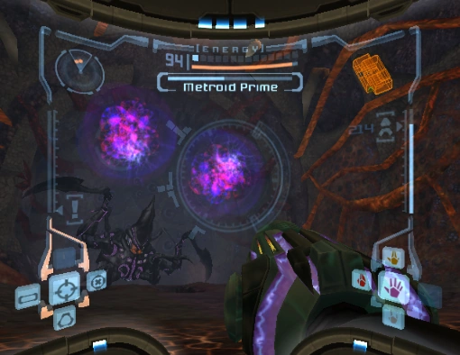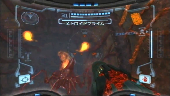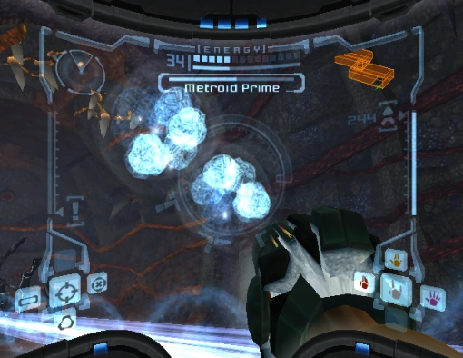 - In Metroid Prime, it is possible for a particle projection to damage Samus during a cutscene. This can cause her to be defeated during a cutscene, forcing to restart the battle even if Metroid Prime is defeated.[1]