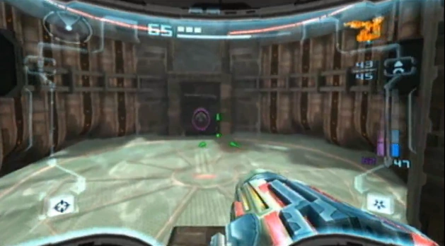Samus enters another circular chamber and finds another of these statues in front of her, which she can jump over, but must be shot to progress further. To her right is yet another statue that blocks eventual access to the Grand Windchamber. Samus will have to kill a Pirate Grenadier and make another turn into another circular corridor filled with water. Here is yet another statue that she must shoot to progress.