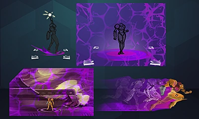 Phase Drift is the fourth and final Aeion Ability in Metroid: Samus Returns. It is acquired from an Aeion Ability Artifact in Area 5. When used, the screen takes on a purplish hue and time is slowed down by 50%, affecting enemies and obstacles, but not Samus herself. This includes graphical effects in the background and the baby's movement. The Phase Drift will even slow down the process of blocks breaking when it is active, which can be inconvenient or beneficial for Samus. For example, when used over a floor of Pit Blocks, Samus can move across them at a normal speed before they break. The Phase Drift is also useful during the final phase of the Diggernaut battle; it is much less difficult to set Bombs on all three weak points before the robot resumes its previous attack pattern.
