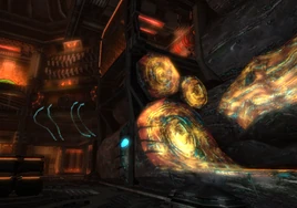 Phazon Quarry can be entered through two levels. The bottom floor is the main entrance, but another door is located on a higher ledge. A small enclosed balcony area is present atop the room, and features several terminals. A secluded passage at the back of the room also features several terminals, one of which is touch-sensitive and operates a Mining Drill. The Drill is used for excavating Phazon in the room, and is on a rail situated on the ceiling. A strange wood-like ore is present around the sides of the room, and has glowing Phazon veins weaving in and out of it. This substance can be harvested by the use of the Mining Drill, and turns a bright orange when cut.