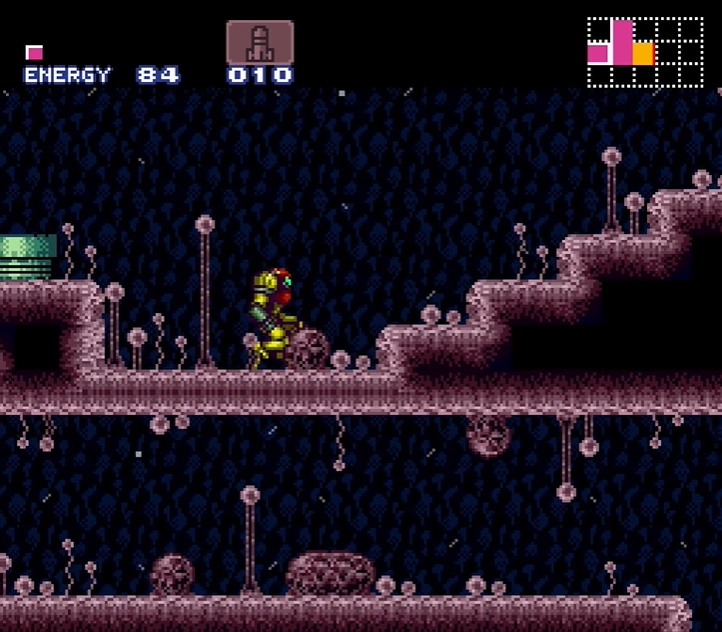 The pink shaft is one of the largest rooms in Brinstar, and perhaps the entire game. It connects to multiple other areas of Brinstar, including the "Red Soil" and green jungle regions. Flakes of an unknown material fall indefinitely in this room, as they do in other "pink" Brinstar rooms. Multiple ledges formed out of the natural pink soil are found, outstretched from walls on either side. The pink shaft is first entered from a door near the top. Immediately above this is a ledge with an Air Hole that spawns Zebs indefinitely. This leads to a series of steps in the right wall, leading up to another walkway, another pair of ledges, and another walkway with another Air Hole spawning Zebs. To the left is a ledge on the wall with a Bomb Block at its base. Behind this block is a door to a Save Room. Adjacent to this is an exit into the room that precedes Spore Spawn.