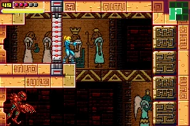 Samus enters this room while she is fleeing Zebesians during her race through Chozodia. Upon entering this room, Samus has a limited amount of time to jump to the upper ledge before a Zebesian comes in behind her. As it walks onto the destructible floor, Samus can shoot at it to send the Zebesian to the base of the shaft, where it is no longer able to reach her. After a short time, the alarm will deactivate and the shutter will lift, allowing Samus to continue. If a Perfect Stealth run is being performed and Samus has not been detected up to this point, the shutter will not be active.