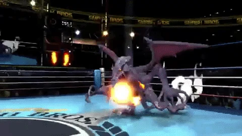 Should an opponent hit Ridley's mouth while he is preparing this attack, the fireball will explode in his mouth, dealing 8-20% damage to him and leaving him stunned temporarily. The "hurtbox" of Ridley's Plasma Breath references Meta Ridley's weakness during the battles against him in Metroid Prime and Metroid Prime 3: Corruption, wherein shooting Ridley in the mouth enough would cause him to recoil back in pain.