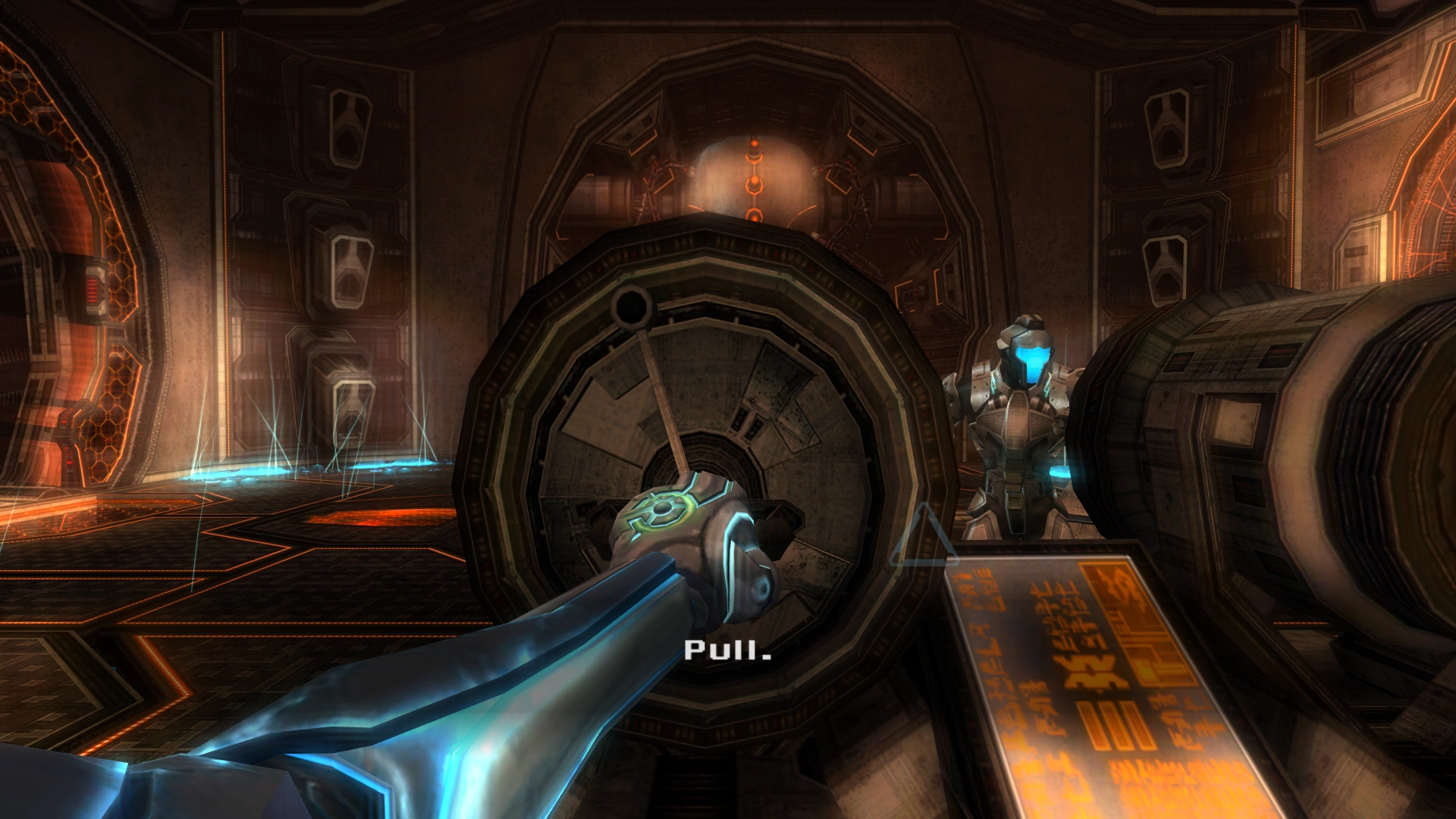 As I'm sure you know, the path to the Seed entrance is exposed to the acid rain. However, I've seen the pirates using a special suit shield that protects them from the elements. If you can acquire one of these shield units, you could probably make it to the Seed. Lucky for you, I've seen where they make these devices. Here are the coordinates. I even know a back entrance to that location, but will need your help activating the lift that takes us there. We've got to engage the security levers simultaneously. I'll call out the instructions. We must synchronize our movements or the security clamps won't release. Are you ready? Pull. Twist. Push. (if failed) Remember, Samus, we have to synchronize our moves in order to activate the lift. Let's try again. |