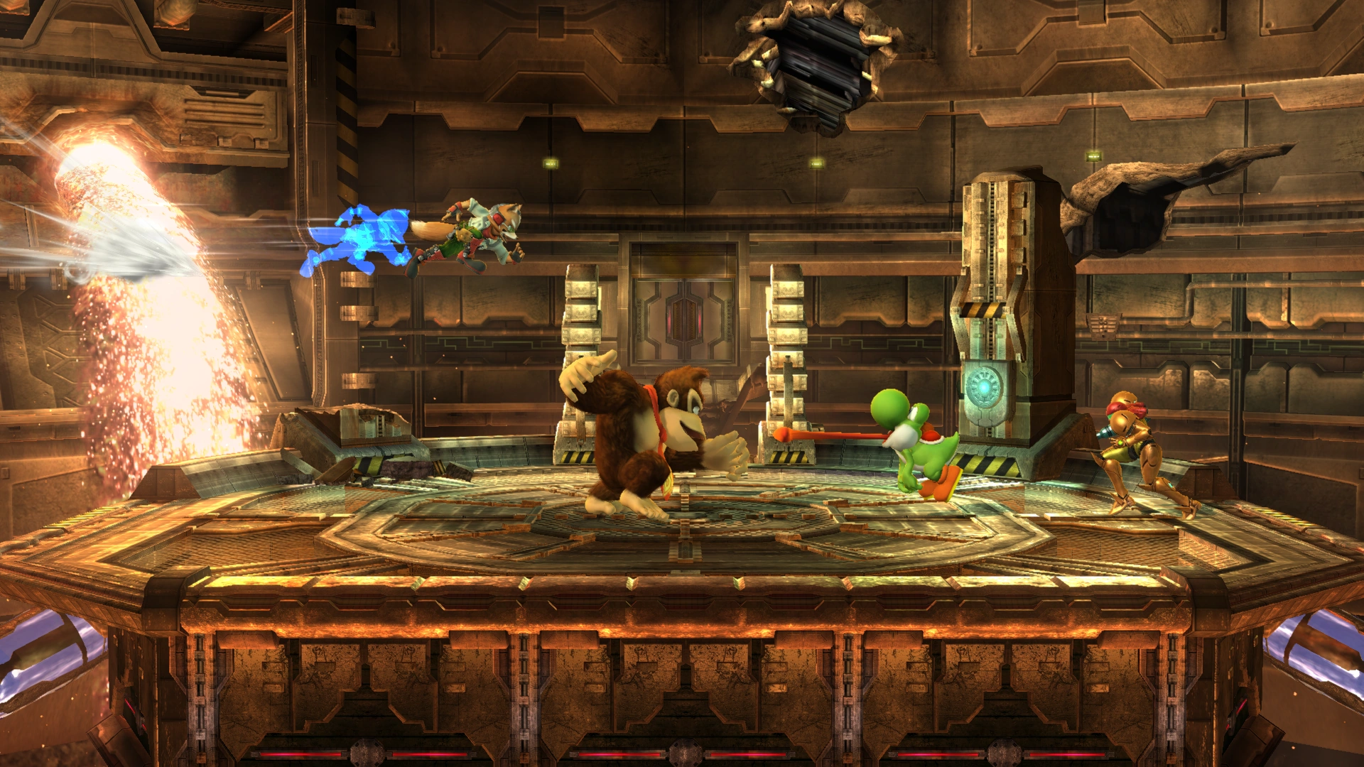 Samus fighting Yoshi, Donkey Kong, and Fox.