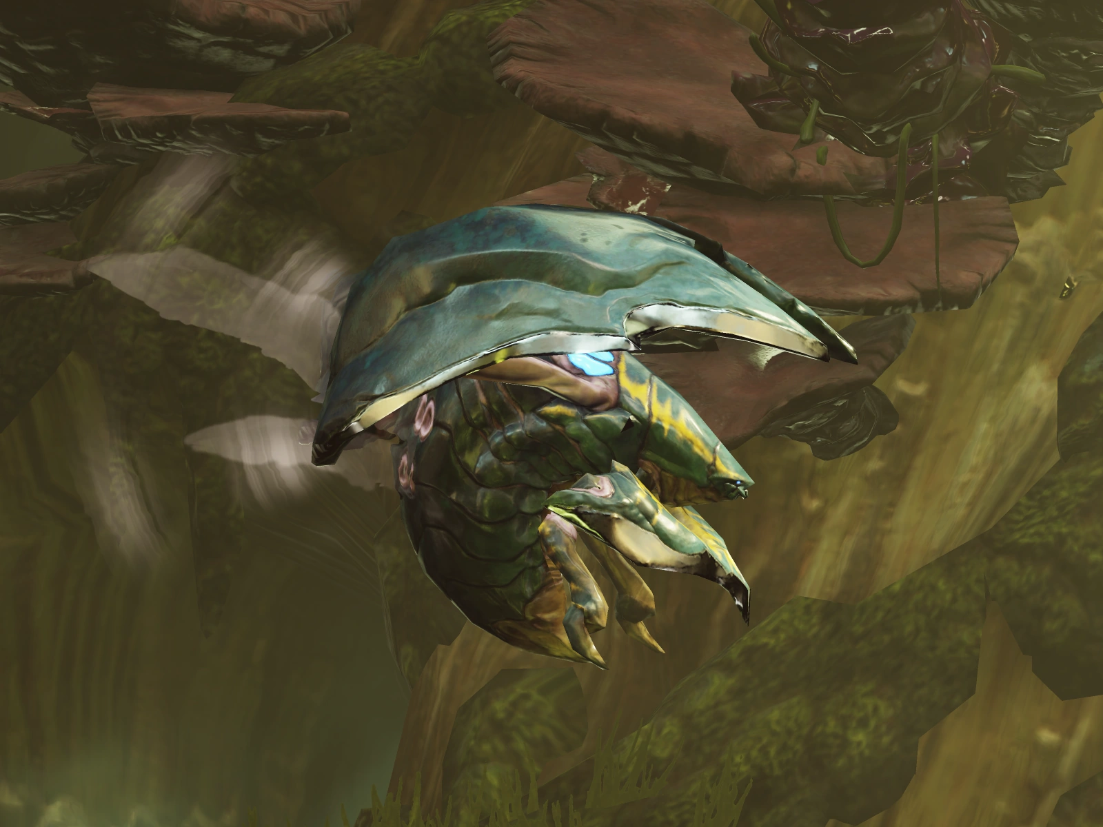 "This insect-like, mid-sized flying creature is native to ZDR. When it detects Samus, it homes in on her position and charges at great speed. This creature is very fast and thus tricky to counter, but a successful strike will open up a big chance to attack. Using abilities like Flash Shift and slide to effectively avoid its attacks, then hitting it with Missiles is also a good option."