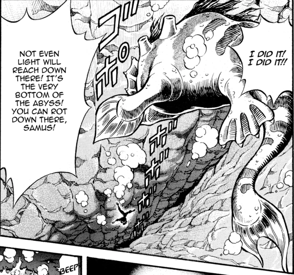 Samus learns of a "Sea Demon" from the townspeople and assumes this is Defen. On the beach, Defen drops her comrades Joey and Diesel into the poisonous water, which is the final part of Defen's plan to kill Samus, as it provokes her into diving in after them. She quickly begins to suffer from the effects of the acid on her Power Suit, in addition to the attacks from Defen and Rastodon and so Samus falls, weakened, to the ocean floor. However, motivated to fight for Joey's sake, she discovers an inactive volcano and triggers an eruption, which saves her and kills Rastodon and Defen.