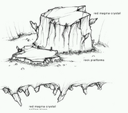 In the Monitor Station, several red magma crystals can be seen, a large one protruding from a wall, tiny ones protruding from the ground nearby an exit, and some crystal rock embedded into an enormous rock pillar.