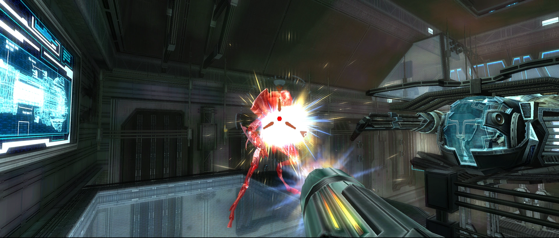 In an early demo of Corruption, the debris blocking the Hand Scanner is already present upon entry, and consisted of a bent and damaged panels. Seven Aeromines in groups of three and four, and three additional Pirate Militia are present on the upper ledges, which they are not in the final release. Only one Crawltank appears in Repair Bay A, while in the final game, there are two.[1]