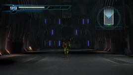 When Samus initially enters the room, it has no power like much of the sector. As she approaches the wall, Brugs can be seen crawling up the side of it, foreshadowing a coming encounter. A tutorial for the Kick Climb appears on-screen, as a reminder of how to perform the technique (although it was performed during the training sequence). Once she has reached the top, she can continue through the Main Sector.