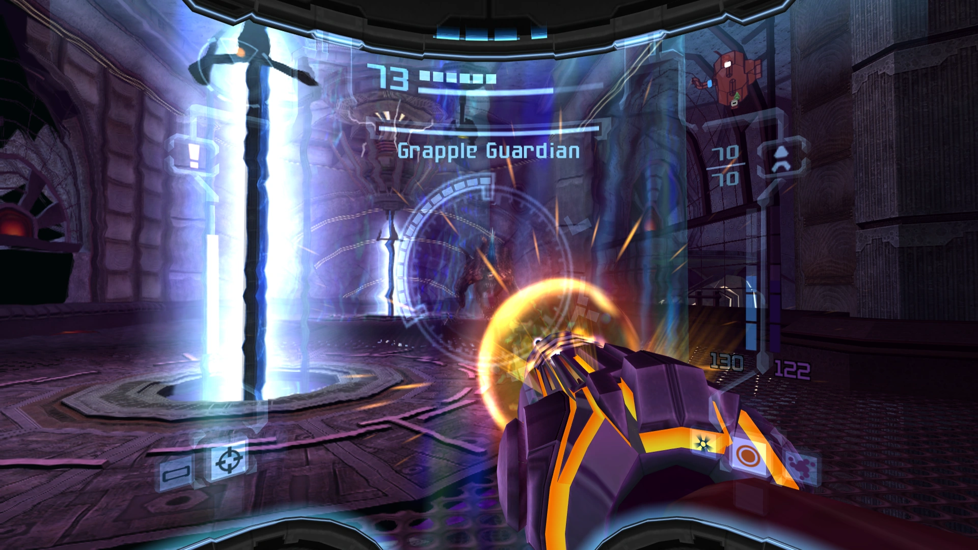 This is the place where the Grapple Guardian is fought. After Samus recovers her stolen Grapple Beam from the fallen beast, the grated floor above lowers to ground level, removing the second elevation entirely save for the center Blue Door. As a result of lower elevation change, the Denzium grates housed on the sides of the room now cover the two ground exits, forcing Samus to escape the room through the remaining unblocked third door by using a Grapple Point. The grated floor also covers most of the dark water pond.
