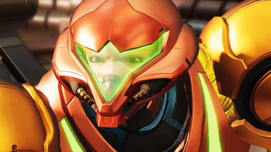 Samus's feelings are often expressed through her eyes, as seen here in Metroid Dread, when she glares at the Robot Chozo Soldier that has killed Quiet Robe.