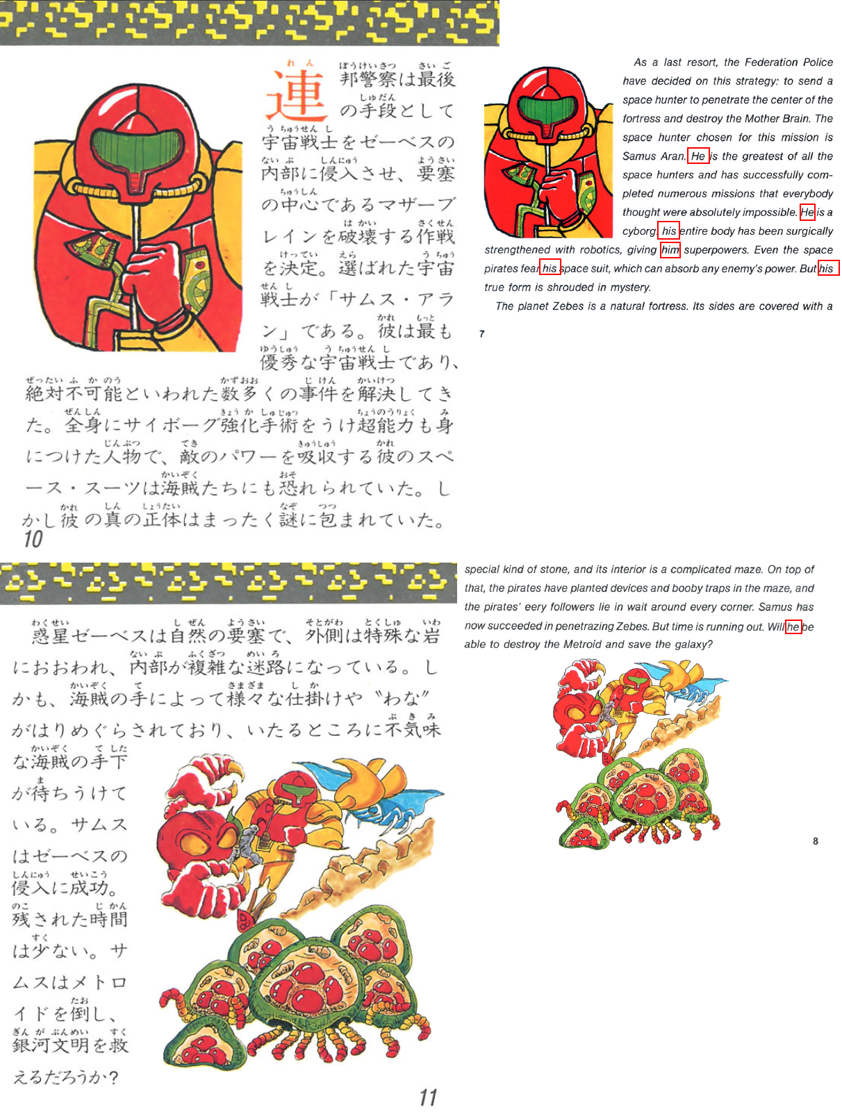 - ^ Page 7 (translated from pg 10 of Japanese) includes "The space hunter chosen for this mission is Samus Aran. He is the greatest of all the space hunters and has successfully completed numerous missions that everybody thought were absolutely impossible. He is a cyborg, his entire body has been surgically strengthened with robotics, giving him superpowers. Even the space pirates fear his space suit, which can absorb any enemy's power but his true form is shrouded in mystery." see File:SamusMalePronouns.png for scans