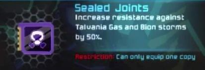 Sealed Joints is a MOD in Metroid Prime: Federation Force. As with many other MODs, only one copy of it can be equipped at a time. When equipped, it will increase the using Mech's defensive capabilities and allow it to better resist the corrosive effects of Talvania Gas, and damage dealt by Bion storms. This is similar to the elemental resistance properties granted by Samus Aran's Suits, in particular the Varia and Gravity Suits. However, unlike Samus's suits, Sealed Joints primarily reduces damage from the gas and storms, and does not render them completely harmless.