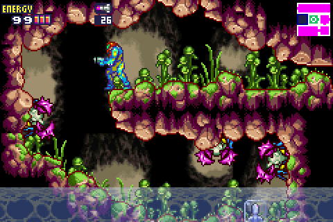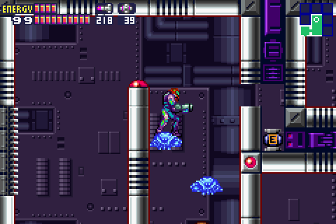 Samus must shoot the base of the right wall of the orange shaft outside the room where she fought the Elephant Bird. She must then build up energy with her Speed Booster, crash through the aforementioned wall into a submerged shaft and save energy for a Shinespark. Finally, she must drop into the water and Shinespark up the other side of the pillar, then shoot part of the wall above to find this Tank.