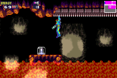 In the room to the left of the extremely large vertical shaft with the Zebesians, is the Missile Tank. Samus must grab the rungs that go above the lava to get to the platform with the tank.