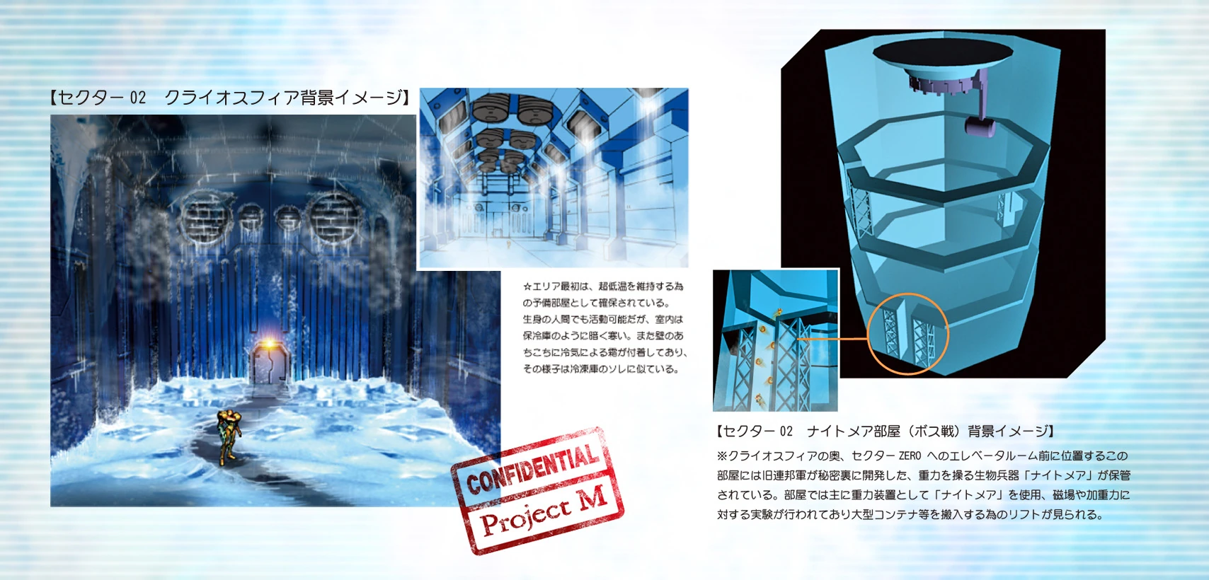 Sector 2 / Cryosphere (セクター2・クライオスフィア Sekutā 2 · Kuraiosufia), is the arctic environment on the BOTTLE SHIP. The Cryosphere is a frigid environment created to sustain life for the various creatures of the BOTTLE SHIP that are adapted to live at cold temperatures. Many species such as Volfons, Gigafraugs, Himellas, and even the plantlike Groganch are seen here. Rooms in the sector include the Water Tank, the Sector Generator Room, the Experiment Floor, the Materials Storehouse, the Materials Transfer Lift, and Nightmare's Room. Adam authorizes Samus to use the Speed Booster and Shinespark simultaneously and the Wave Beam here.