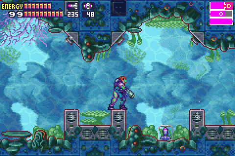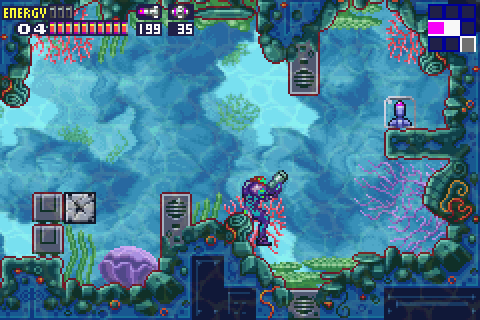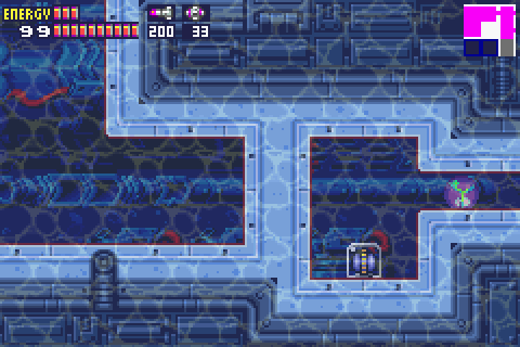 The Missile Tank is in the room blocked off by Boost Blocks on both sides. The room is located above a Save Station. It is in the tank of water at the top of the room.