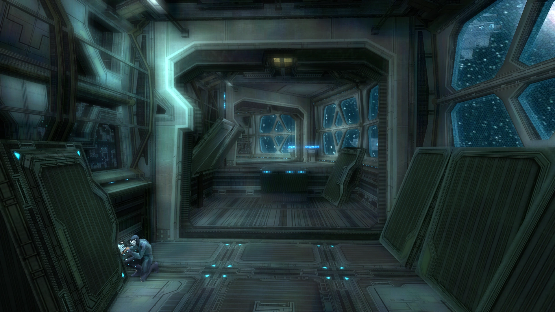 - 1 Federation Marine (approaches from Command Lift A door, walks over to north side near the middle of the room and stands in front of window)