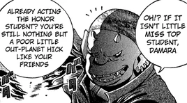 "Sir"[1] is a student at the Daiban Federation Academy. In one scene during chapter 14 of the Metroid Manga, he can be seen bullying one of Damara's friends. Damara then steps in, angry at him for trying to "defile the holy academy with violence". He repeatedly calls her and her friends "out-planet hicks" and "poor potato farmers" for coming from rural areas in the galaxy (such as Jigrad in Damara's case). He is then later mauled by Pyonchi, when Samus, Adam Malkovich and Chairman Keaton arrive to discuss Samus' Zero Mission.