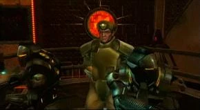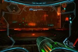Later, when Samus has disabled the planet's defense system generator, she returns to this room. The G.F.S. Olympus flies over, and Fleet Admiral Castor Dane as well as several Demolition Troopers arrive that brief Samus on her upcoming mission as they destroy the gate. Samus then proceeds to the cargo-supply line leading to the Pirate Homeworld Seed, protecting twelve Demolition Troopers as they try to get to the seed entrance.