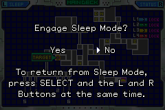 The Sleep Mode option is present in certain Game Boy Advance titles. In Metroid Fusion and Metroid: Zero Mission, pressing the L button on the map screen will bring up the Sleep Mode screen.[1][2] In the Classic NES Series port of Metroid, the Sleep Mode option can be selected from the Menu screen.[3] Activating Sleep Mode will turn off the screen and sound while still retaining the game's progress. The game will resume from Sleep Mode if the L, R and Select buttons are pressed simultaneously. The Sleep Mode option can also be done with the Nintendo 3DS Virtual Console versions of GBA titles from the Ambassador Program, but not with their Wii U Virtual Console releases.
