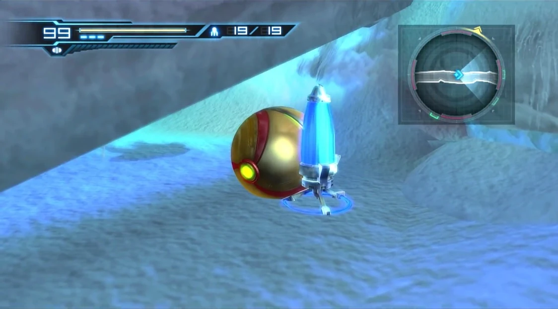 - Missile Tank!:There is a Missile Tank underneath one of the fallen ice pillars at this location. Use Morph Ball mode to roll under the pillar and pick it up.