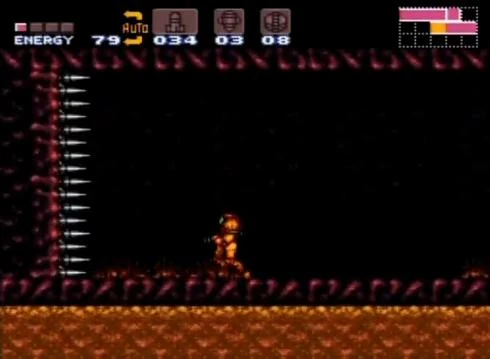 Spikes in the Metroid series are elongated, pointed objects of either metal, stone, or organic matter that cause considerable damage on contact. These first appeared in Metroid II: Return of Samus, and made an appearance later in Super Metroid. Spikes can be found on ceilings, walls, and even on the ground, occasionally forcing Samus to use the Grapple Beam to traverse to the other side. Some spikes are seen to grow out of red or green organic material in Brinstar, which resembles the concealed movement pads of Aether.