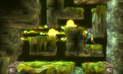 A steel orb (as named in the Metroid: Samus Returns Official Guide) is an egg-like obstacle encountered throughout SR388 in Metroid: Samus Returns. Despite their name, they have a rather gelatinous texture. They resemble small Metroid Eggs and can only be destroyed with a Power Bomb or the Beam Burst Aeion Ability, first appearing shortly after the latter ability is obtained in Area 3. They are later seen shortly after the Beam Burst is obtained in the same area. Another steel orb appears in Area 2, in one of the superheated rooms, blocking a Missile Tank next to a Teleport Station. Two steel orbs appear in the aquatic portion of Area 5, blocking another Missile Tank.