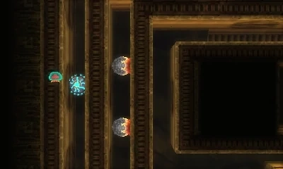 After defeating the Metroid, destroy the steel orb in the center of the room with your Beam Burst, then roll through the opening and exit through the room’s east door.
