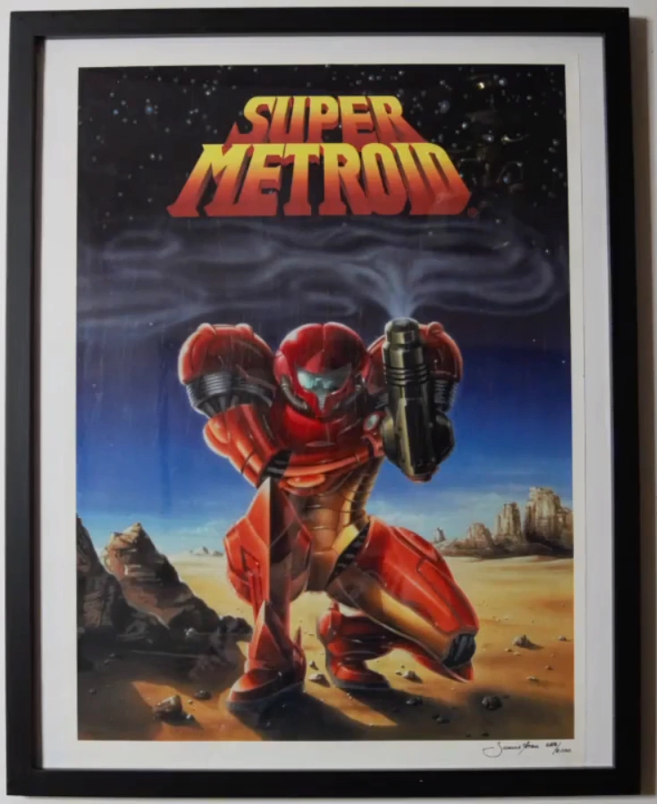 Despite being for Super Metroid, the poster actually depicts the stock art for Metroid II: Return of Samus, albeit with improved lighting, as well as more stars in the sky. As the image has been flipped, Samus Aran's Arm Cannon is thus on the wrong arm. The Super Metroid logo is displayed above the smoke emanating from the Arm Cannon barrel.