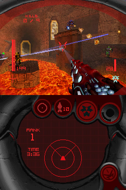 In Metroid Prime Hunters, each Bounty Hunter has two unique Targeting Reticules as part of their Heads-Up Display: one standard reticule and a smaller (although similar) one that is used while firing or charging an Arm Cannon weapon. For example, Samus's standard Targeting Reticule is a green dot surrounded by the same three lines as in the Wii versions of the Trilogy, although they are now rounded to form a circle; when using a weapon, the dot in the middle disappears and the circle tightens. Spire's standard Targeting Reticule is an ornate pattern with a targeting dot and fragments of a square and a triangle, respectively; when he uses a weapon, the dot disappears and the remaining patterns merge to form a simple diamond shape with a filled-in triangle on top of it. The Imperialist has two Targeting Reticules of its own, though both are still colored according to the user's color scheme (for example, green for Samus and orange for Spire) and do not change when firing the Imperialist: a simple, circular reticule for the standard view and a larger crosshair for precise aiming when it is zoomed-in.