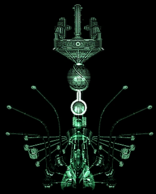 A decorative hologram depicting a Theronian Bomb component, seen above the doors leading into the Concourse building.