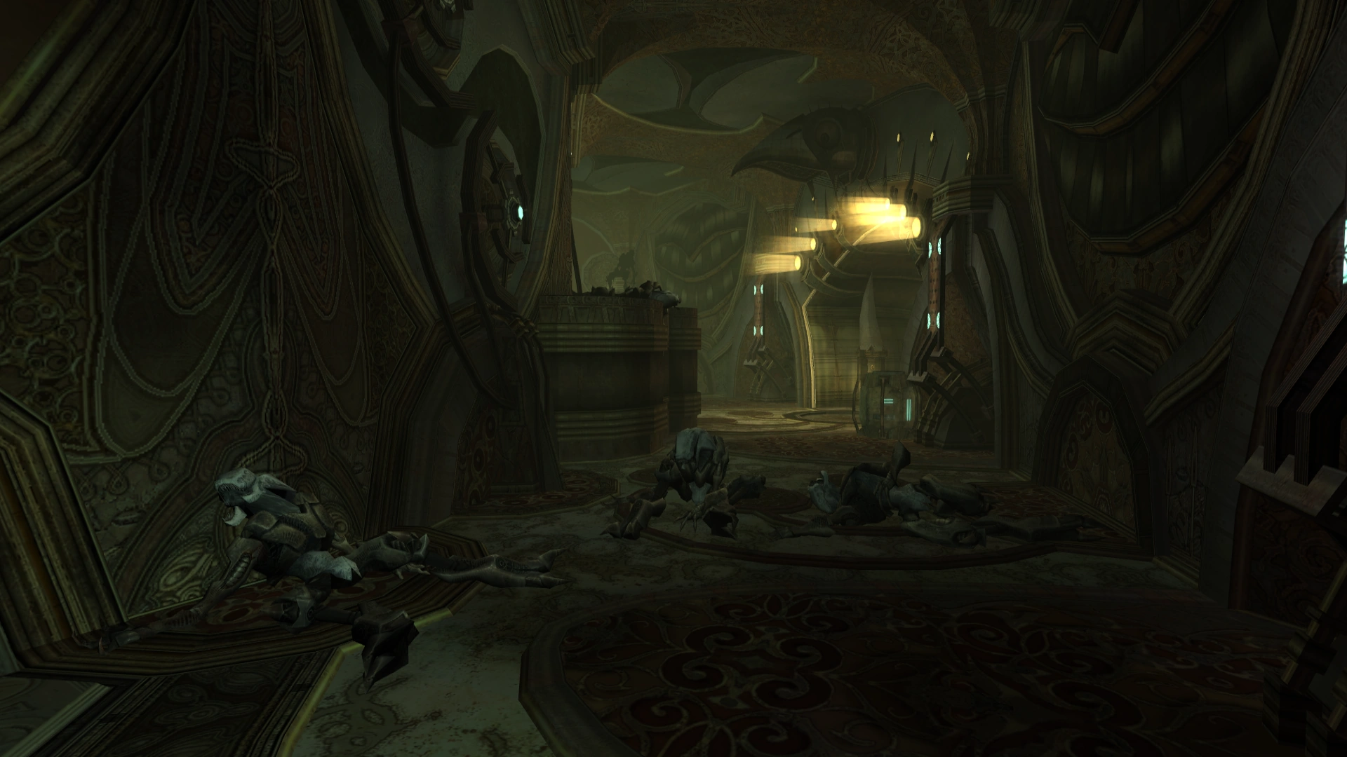 When Samus first enters this room from Zipline Station Delta, a brittle husk leaning against the door, all that remains of a deceased Pirate Trooper, falls apart. Multiple other Space Pirate husks can be found around the room, a hallway with a 90-degree curve. Growths of Phazon can be found near the door leading to Research Pod Lift. A small corridor, with a statue of a Chozo head above it, breaks off at 45 degrees from the main hallway and leads to Save Station C.